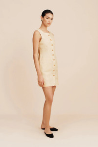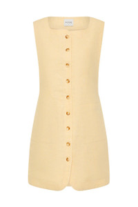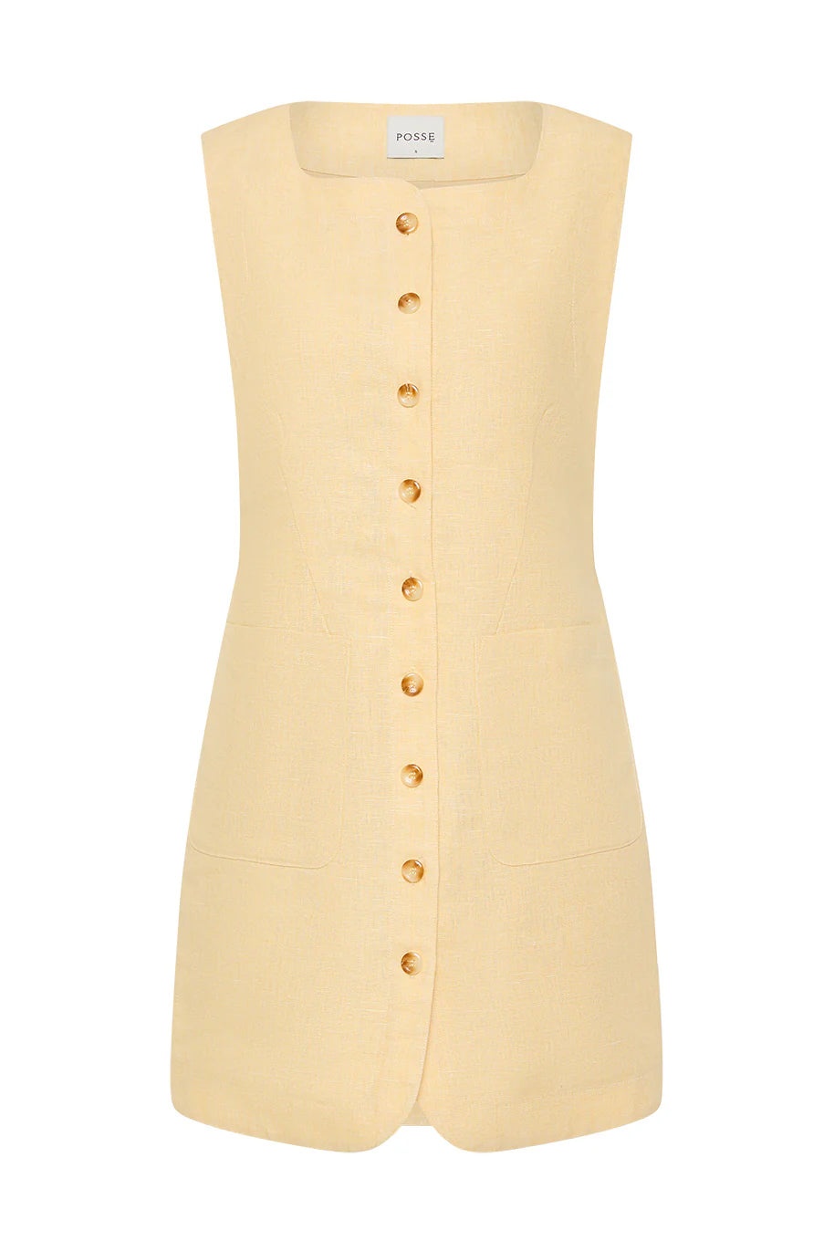 POSSE Emma Button Down Mini Dress Cut from premium linen, the Emma Mini Dress features an elegant high neckline, mottled centre-front buttons and a curved hem. Use the adjustable back buckle to create a cinched silhouette. Composition: 100% Linen Color: Dusty Citron Fit: True to Size