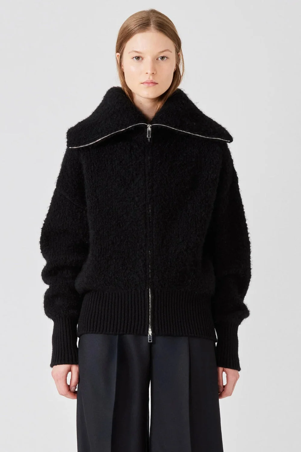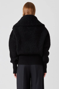 SA SU PHI Teddy Zipped Bomber Black The Teddy Zipped Bomber is crafted from a plush blend of cashmere, alpaca, and silk. The voluminous sleeves and rounded shoulders add soft structure, while the front zip and ribbed trims bring a sporty finish. The exaggerated collar can be styled open or zipped high for added warmth. Pair it with fluid skirts for contrast or with tailored separates to elevate everyday layering. Composition: 48% Cashmere 32% Alpaca 20% Silk Color: Black Fit: True to Size
