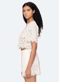 SEA Babette Tie Front Top The Babette eyelet top features front-tie closures, all-over eyelet detailing, and scalloped edges for a breezy, polished look. Pair it with the Babette shorts for a perfectly coordinated, effortless cover up. Composition: 100% Cotton Color: White Fit: Model is 5'10'' and wearing a size S