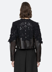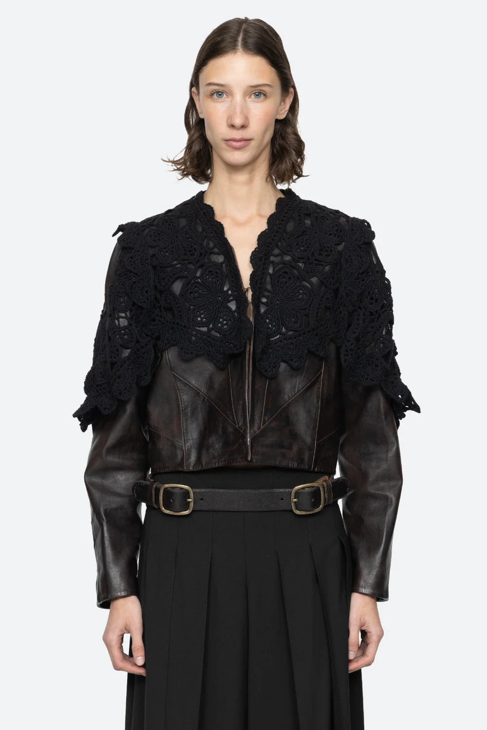 SEA Gwen Leather Jacket Crochet Overlay The Gwen leather jacket is crafted from smooth leather in a cropped silhouette. Delicate hand-crocheted detailing across the upper body lends a refined, artisanal finish. Composition: Self-100% Lamb Leather, Lace-70% Cotton, 30% Polyester Color: Brown Fit: Model is 5'10'' and wearing a size S