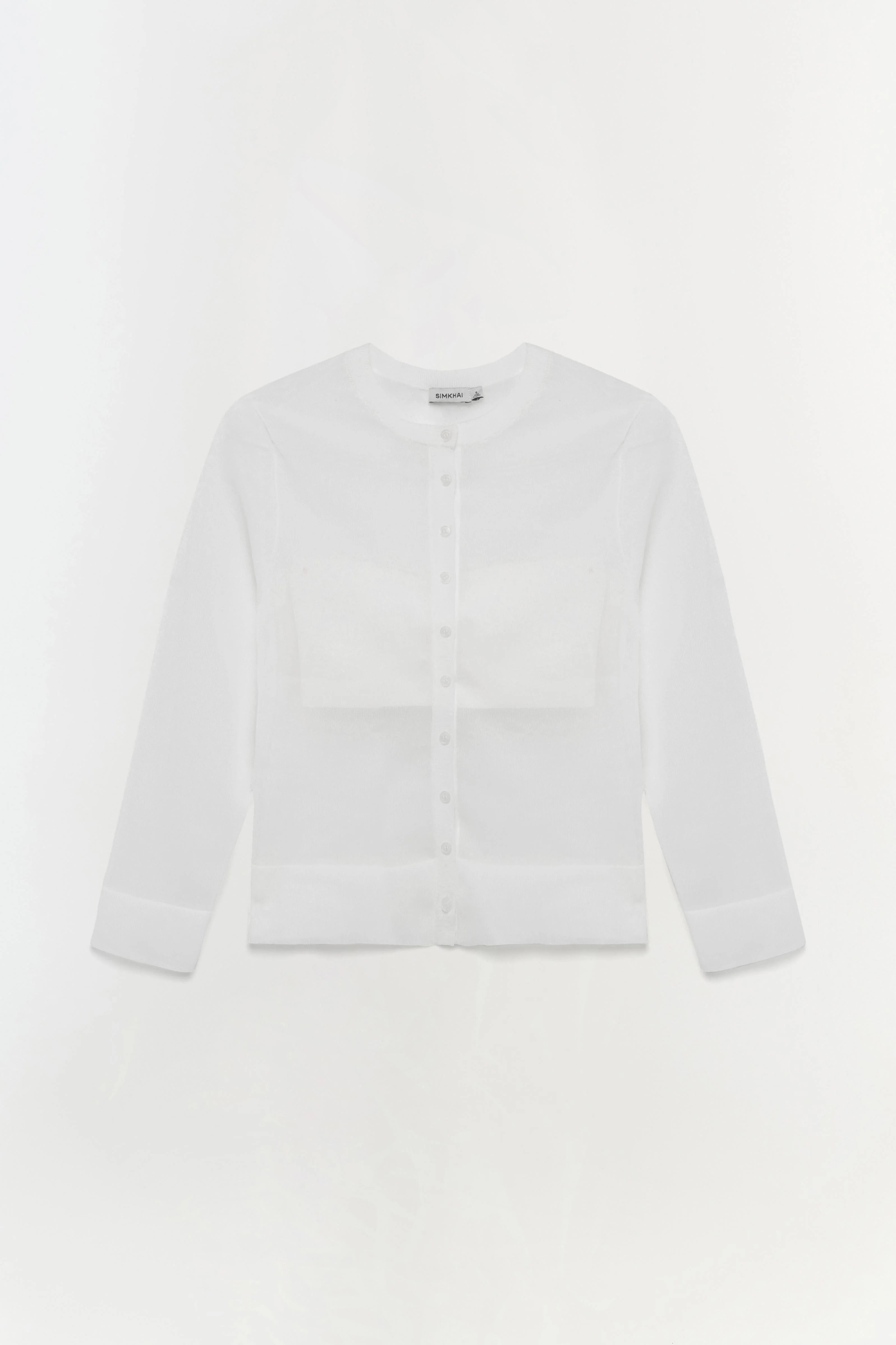 SIMKHAI Rachel Cardigan The Rachel Sheer Knit Cardigan in Ivory. This sheer overlay cardigan features a lightweight, ethereal design with delicate transparency and modern detailing. Composition: 100% Polyester Color: Ivory Fit: True to size