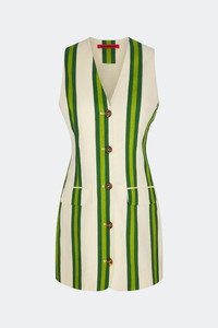 SIMON MILLER Carob Printed Linen Mini Dress Lightweight linen blend mini dress in new a Cafe Tropical stripes Composition: 55% Linen 45% Cotton Color: Cream-Green Stripe Fit: True to Size