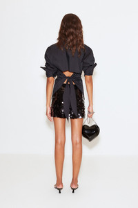 SIMON MILLER Loch Poplin Button Up Black Stretch Cotton Poplin, with Cut Out Back and Adjustable Tie for Fit Flexibility. The Ultimate, Versatile Piece to Dress Up or Down. Composition: 78% Cotton 19% Nylon 3% Spandex Color: Black Fit: True to Size