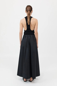 ST. AGNI Plunge Neck Dress A feminine take on the classic maxi dress, the Plunge Neck Dress boasts an A-line shape, scooped neckline, knitted bodice, racerback and maxi length. The Plunge Neck Dress is an essential wardrobe piece destined for high daily wear. Composition: Bodice-53% Viscose, 47% Recycled Polyester Skirt-100% BCI Cotton Color: Black Fit: True to Size