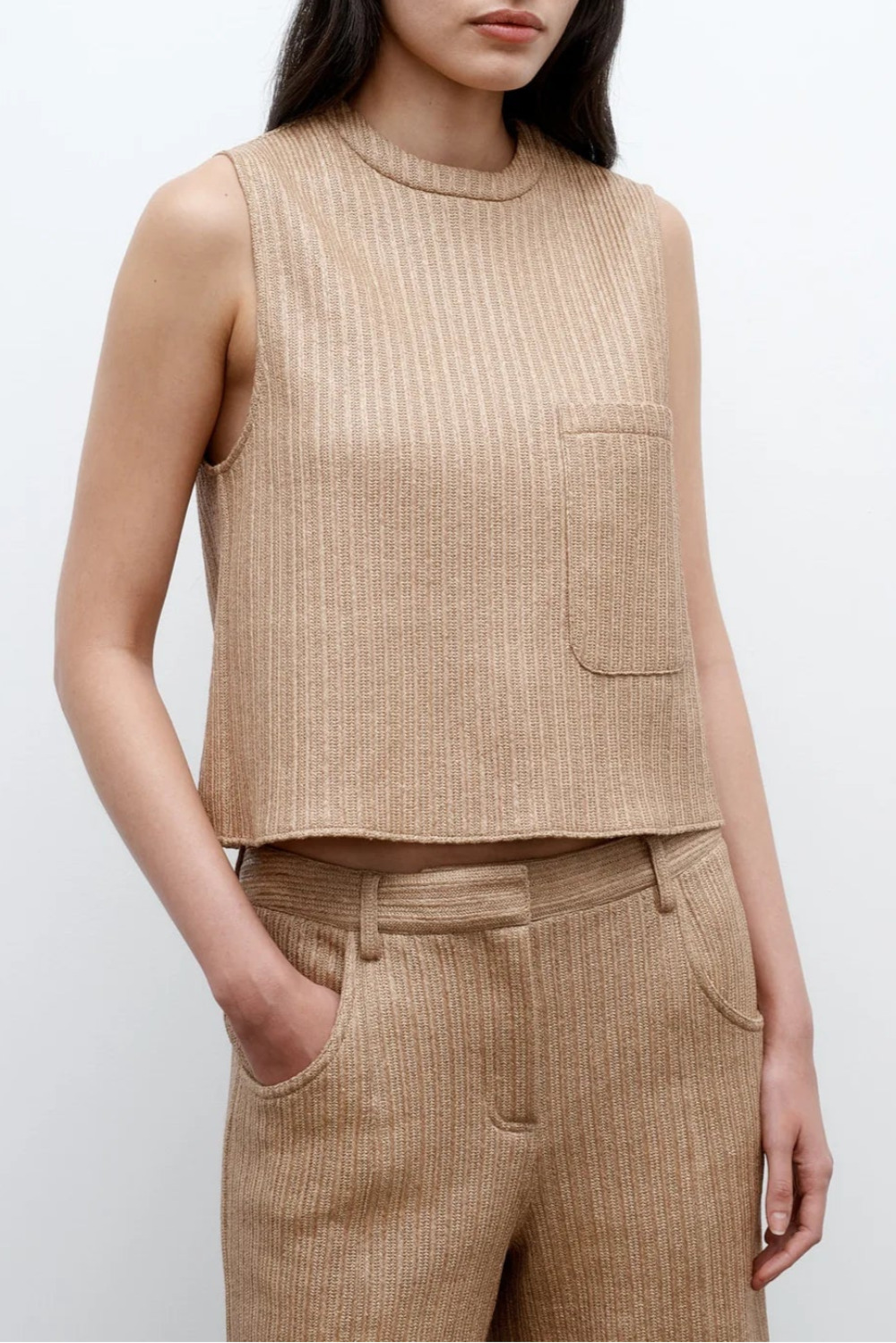 T.W.P. Cropped Muscle Tank In Soft Cotton Raffia Cropped, round neck tank top in soft cotton raffia. This top is a boxy fit with elongated arm holes. Complete with a chest patch pocket and concealed zip at the back. Composition: 57% Nylon , 43% Hemp Color: Natural Fit: True To Size