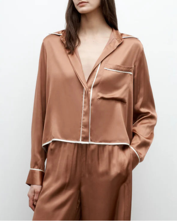 TWP Sleepover Top Argan Oil Cropped button down shirt in shiny satin. This fabric is a lightweight viscose satin with a liquid finish that creates the elegant shine of silk. The sleepover top is a relaxed fit with contrast piping at the seams – an elevated take on a PJ shirt, designed for everyday wear. Complete with a concealed placket, chest patch pocket, and barrel cuffs. Composition: 100% Viscose Color: Argan Oil Fit: Model is 5'10'' with 32.5'' bust / 34.5'' hips. Wearing size S