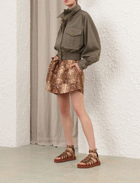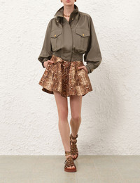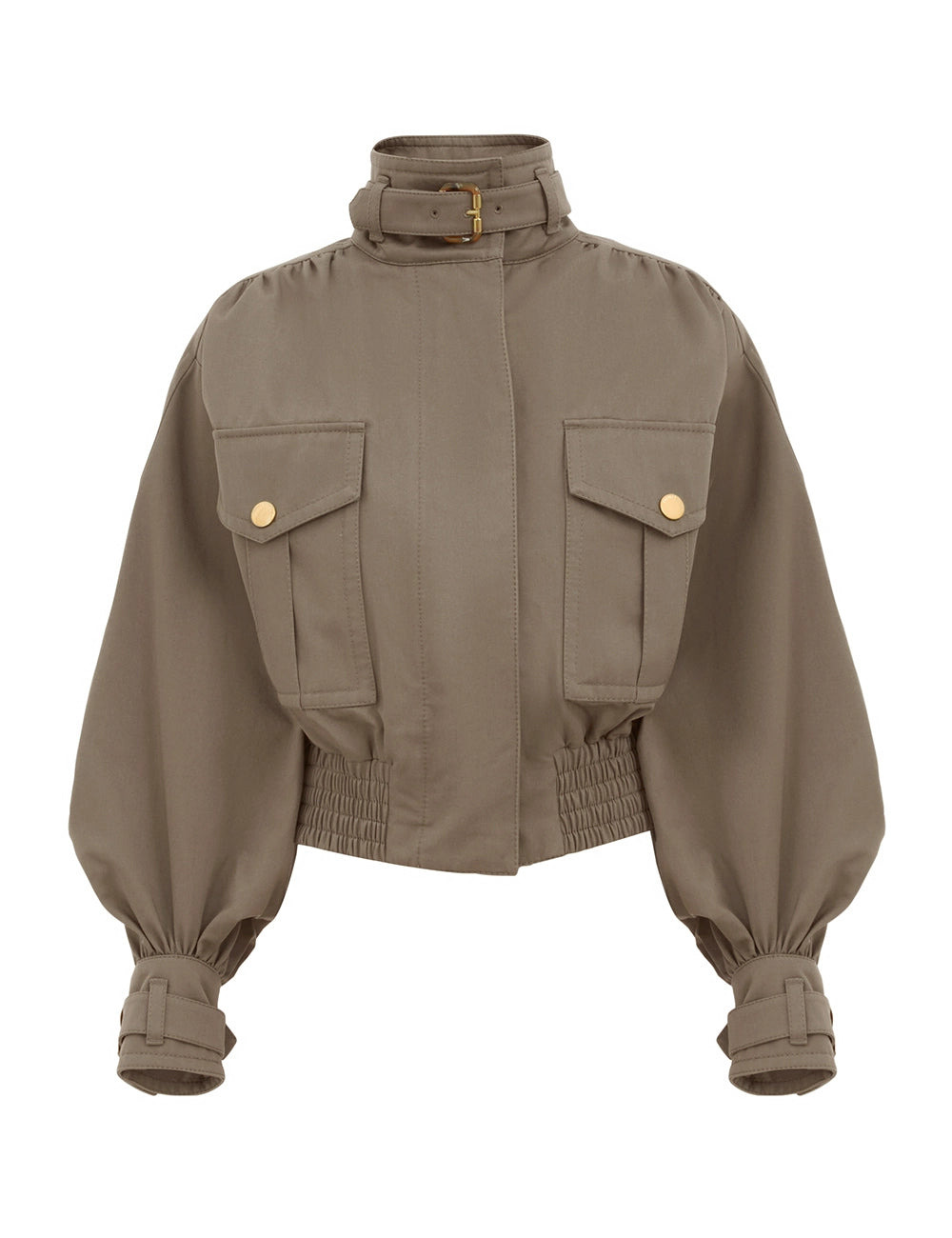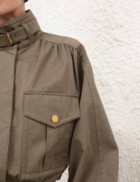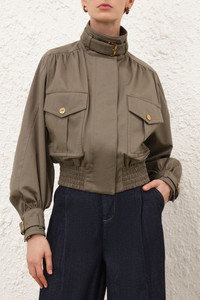 ZIMMERMANN Hypnotic Biker Jacket The Hypnotic Biker Jacket in Khaki from our Fall 2025 Collection, Hypnotic. A relaxed fit biker jacket featuring a high stand collar, concealed front zip with snap closures and functional front flap pockets. Composition: Main: 100% cotton; lining: 75% viscose, 25% silk Color: Khaki Size: True to size