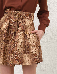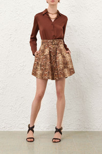 ZIMMERMANN Hypnotic Utility Mini Skirt The Hypnotic Utility Mini Skirt in Toffee Snake from our Fall 2025 Collection, Hypnotic. A silk blend mini skirt featuring a removable D-ring waist belt and functional front patch pockets. Composition: Main: 53% silk, 47% cotton; lining: 100% viscose Color: Toffee Snake Size: True to size