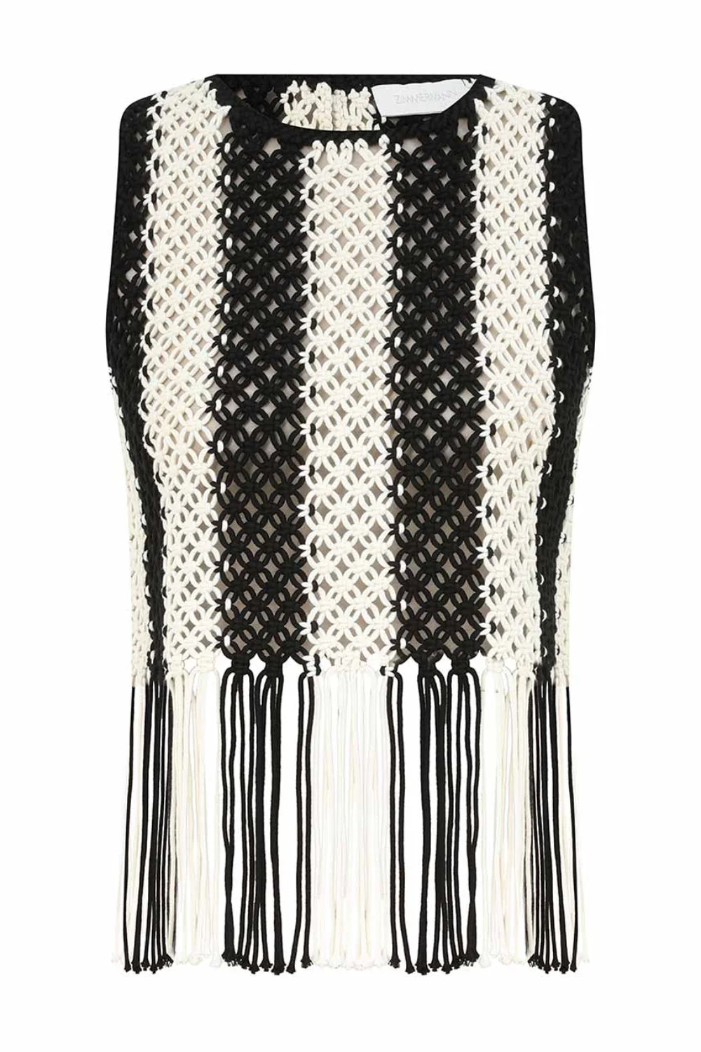 ZIMMERMANN Wanderlust Macrame Tank The Wanderlust Macrame Tank in Black/Ivory from our Resort Swim 2026 Collection. A knit tank top featuring a round neckline, macrame detailing and fringed hem. Color: Ivory Black Fit: True to size