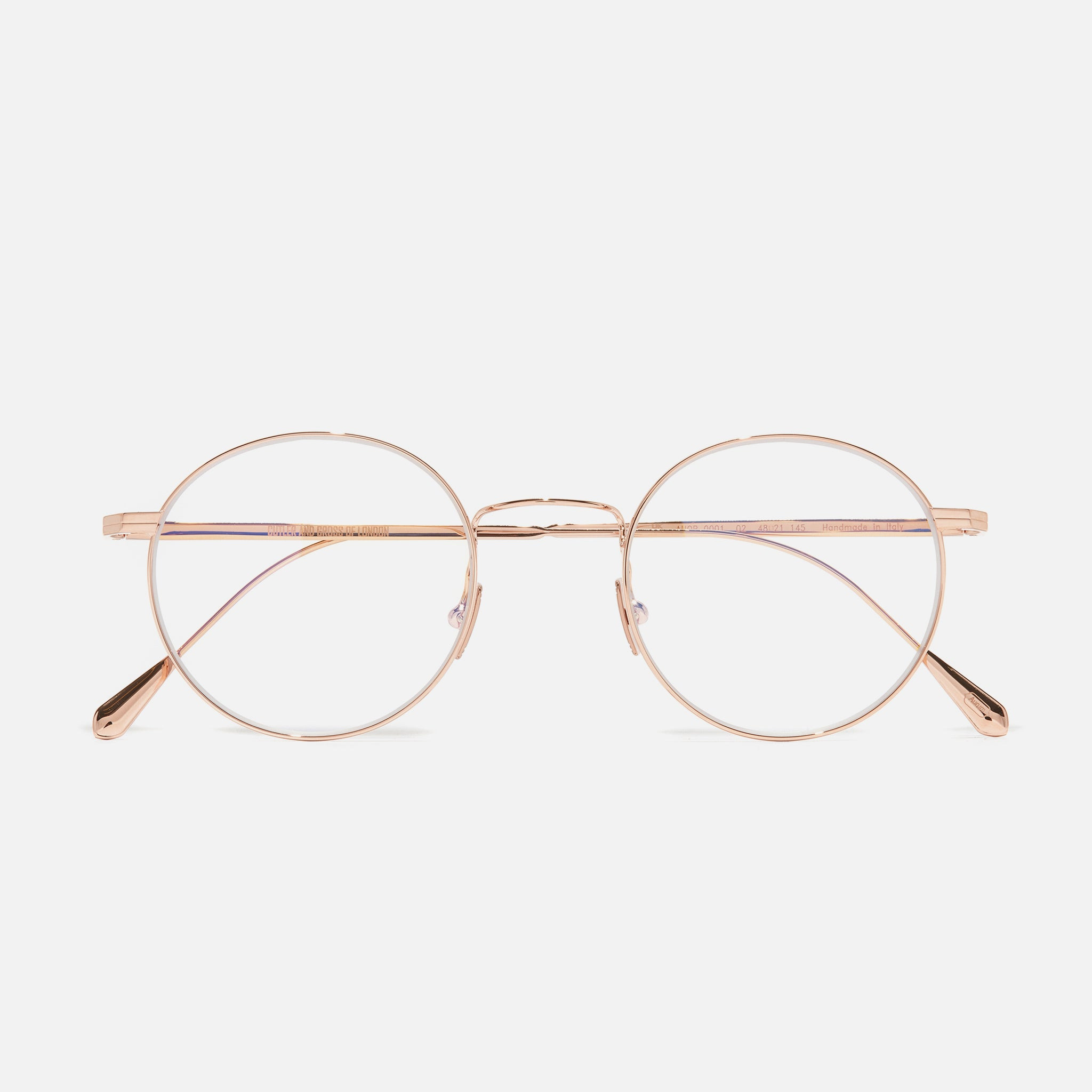 With lightness and functionality as its core, the AUOP 0001 is a contemporary and easy-wearing metal pantos. An inspired renewal of our original 1990s model 0306, this frame allows for uncompromising fit and comfort alongside sharp stylistic features. Available plated in either 18K White Gold, Rhodium, 18K Gold, 18K Rose Gold, or a combination of precious metals Rose Gold 18K + Rhodium 18K. Details - Handcrafted in Italy by expert craftspeople, read more about our craftsmanship story - New Temple Tip inscribed with 'Aurum' - Hypoallergenic Nosepads - Galvanised Precious Metal Finish - Need help? Read our full Glossary of Terms Size & Fit SKU: AUOP-0001-48-02 Frame shape: Round Lens width (mm): 48 Temple length (mm): 145 Bridge width (mm): 21