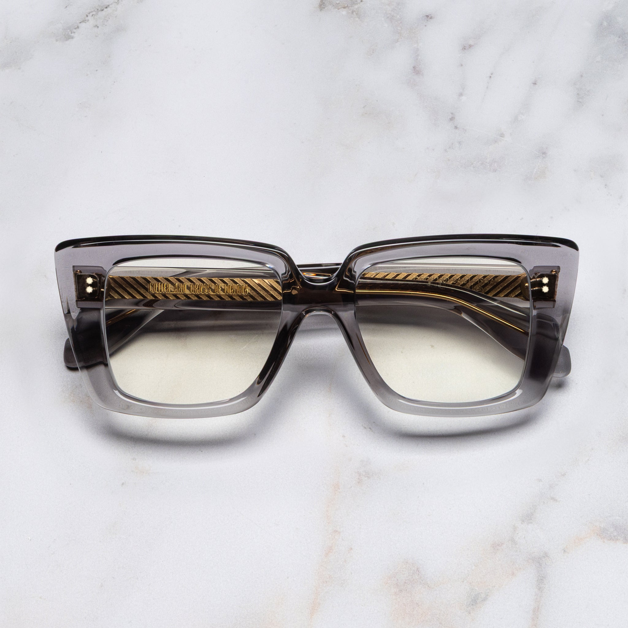 A squared take on the cat-eye, the 1401 optical is shaped with a straightened browline that culminates in angled lugs. Polished Compass Star pins and Hazard core wire add subtle Cutler and Gross prestige. Details - Compass Star frontal and temple pins - 5-barrel hinges - Fender temples - Hazard core wire - Gold-foil logo on inner temple - Handcrafted in Italy by expert craftspeople, read more about our craftsmanship story Size & Fit SKU: CGOP-1401-51-04 Frame shape: Cat-Eye Lens width (mm): 51 Temple length (mm): 145 Bridge width (mm): 19