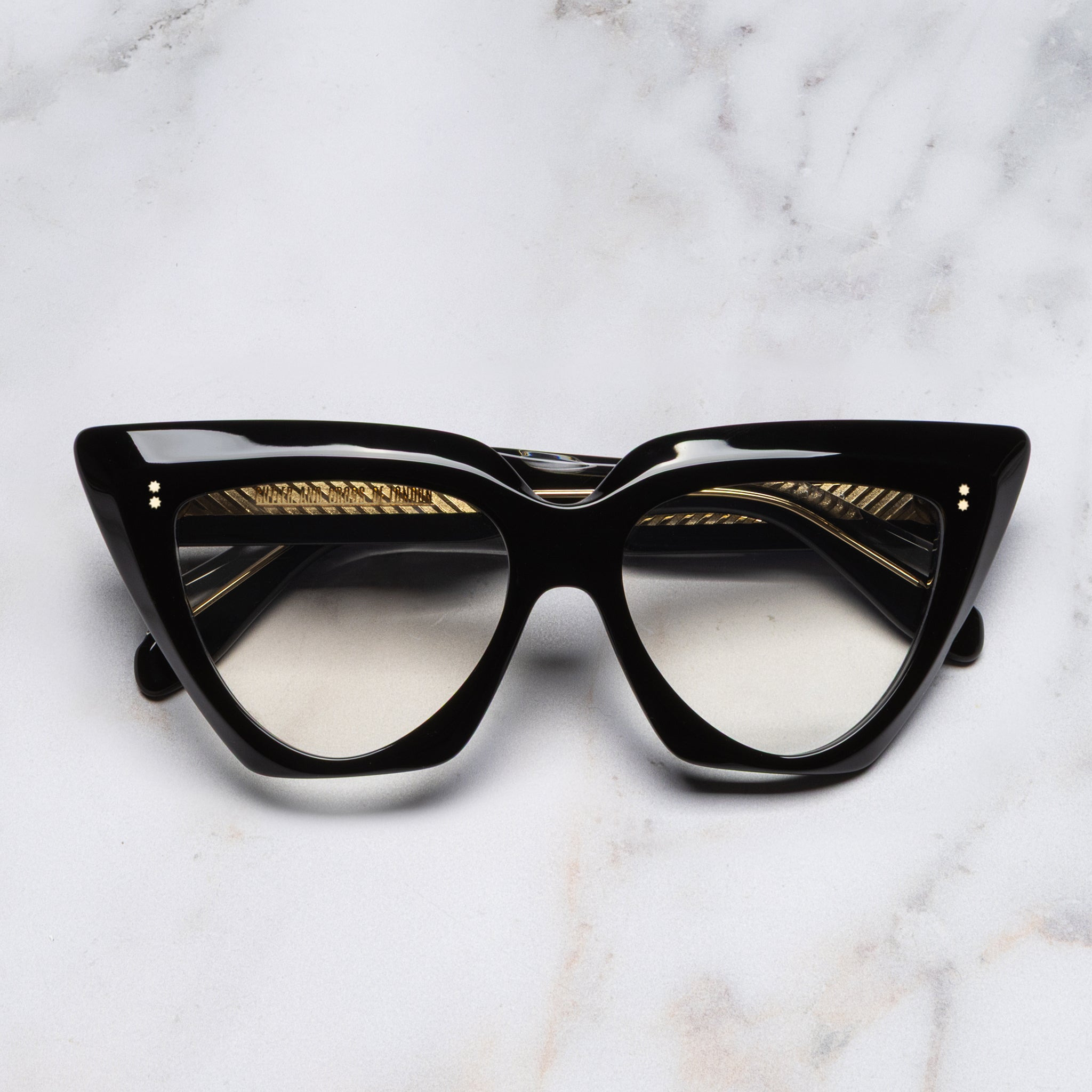 A maximalist take on the cat-eye – the 1407 optical is shaped with a high stepped browline that drops to a rounded base. The split-layer construction adds luminosity, tempering pigmented Black acetate with crystal edges. It's sculpted with bevelling and accented with polished Compass Star pins. Details - Handcrafted in Italy by expert craftspeople, read more about our craftsmanship story - Compass Star frontal and temple pins - 7-barrel hinges - Hazard core wire - Gold-foil logo inside temple - Fender temple tips - Need help? Read our full Glossary of Terms Size & Fit SKU: CGOP-1407-55-01 Lens width (mm): 55 Temple length (mm): 145 Bridge width (mm): 15