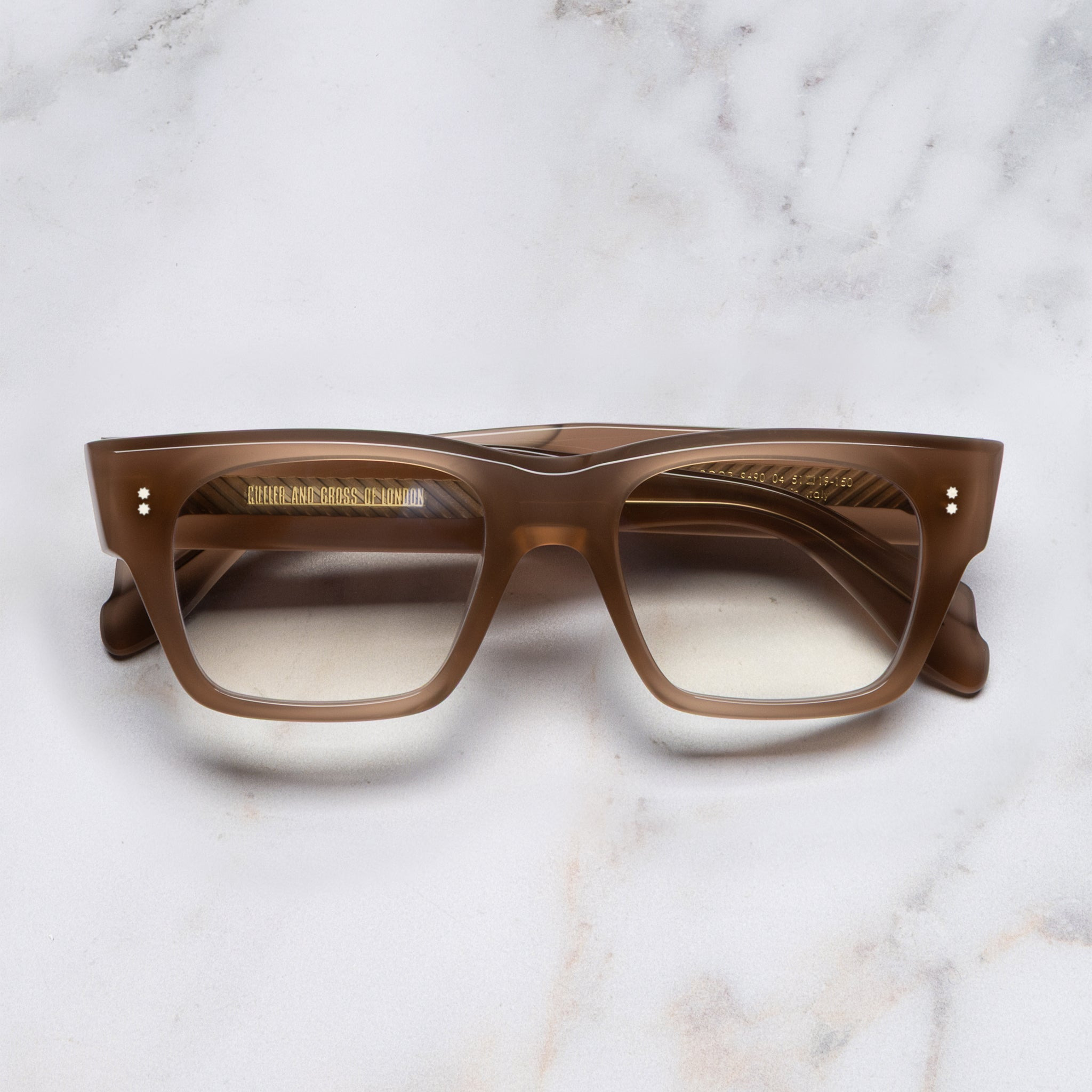 A square optical, the Cutler and Gross way. The 9690 is our creative director's frame of choice, sculpted with chunky temples and stable 7-bar hinges. It nods to angular styles popularised by 90s Hollywood, while striped Hazard core wire adds a contemporary note. Details - Handcrafted in Italy by expert craftspeople, read more about our craftsmanship story - Compass Star frontal and temple pins - 7-barrel hinges - Hazard core wire - Gold-foil logo inside temple - Fender temple tips - Need help? Read our full Glossary of Terms Size & Fit SKU: CGOP-9690-51-04 Frame shape: Square Lens width (mm): 51 Temple length (mm): 150 Bridge width (mm): 19