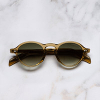 The elegant academia of playwright Arthur Miller in the 60s shaped the GR08 sunglass. It is handcrafted with an undulating browline that culminates in winged lugs. Compass Star pins and Fender temples add signature detail. Designed for slighter face shapes, the Graham Cutler collection scales our bold aesthetic into lighter proportions. Details - Keyhole bridge - Integrated nosepads - Winged lugs - Compass Star frontal and temple pins - Five-barrel hinges Deco core wire - Fender temple tips - Gold-foil logo inside temple - Handmade in Italy Size & Fit SKU: CGSN-GR08-47-04 Frame shape: Round Temple length (mm): 145 Lens width (mm): 47 Bridge width (mm): 22