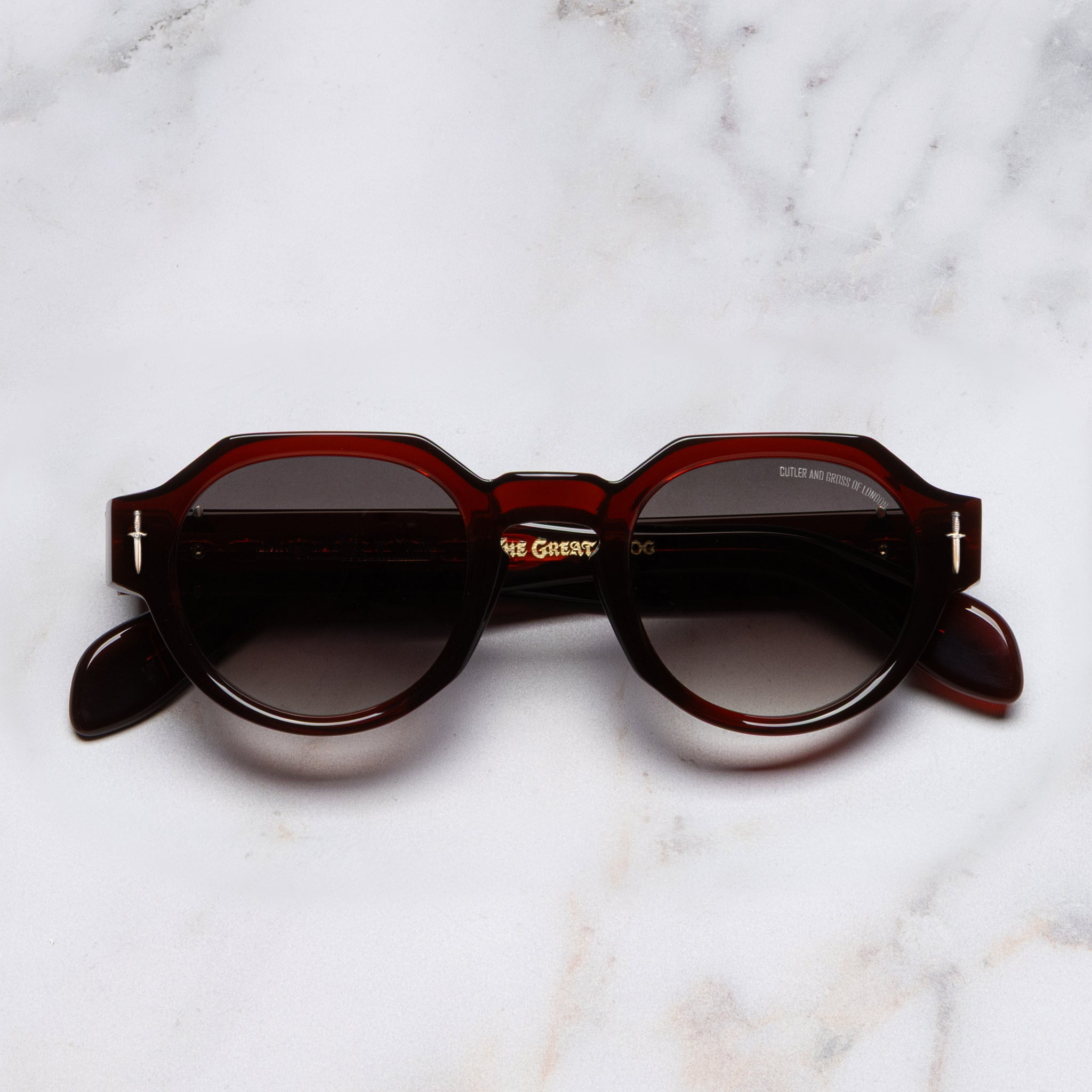 The Cutler and Gross X The Great Frog collaboration fuses heritage handiwork with gothic undertones, and these round sunglasses are exemplary. They're crafted in Italy to a flat-top design that's spliced by Sterling Silver iconography – Dagger frontal pins and Skull and Crossbones emblems at the temples. Flat, gradient lenses complete the set. Details - Handcrafted in Italy by expert craftspeople, read more about our craftsmanship story - The Great Frog Collection - Hand cast Sterling Silver Dagger frontal pins - 7-barrel hinges - Hand cast Sterling Silver Skull and Crossbones temple pins - Custom Lock Down chain core wire - Gold-foil logo inside temple - Plectrum temple tips - Need help? Read our full Glossary of Terms Size & Fit SKU: GFSN-006-48-03 Frame shape: Round Temple length (mm): 150 Lens width (mm): 48 Bridge width (mm): 24