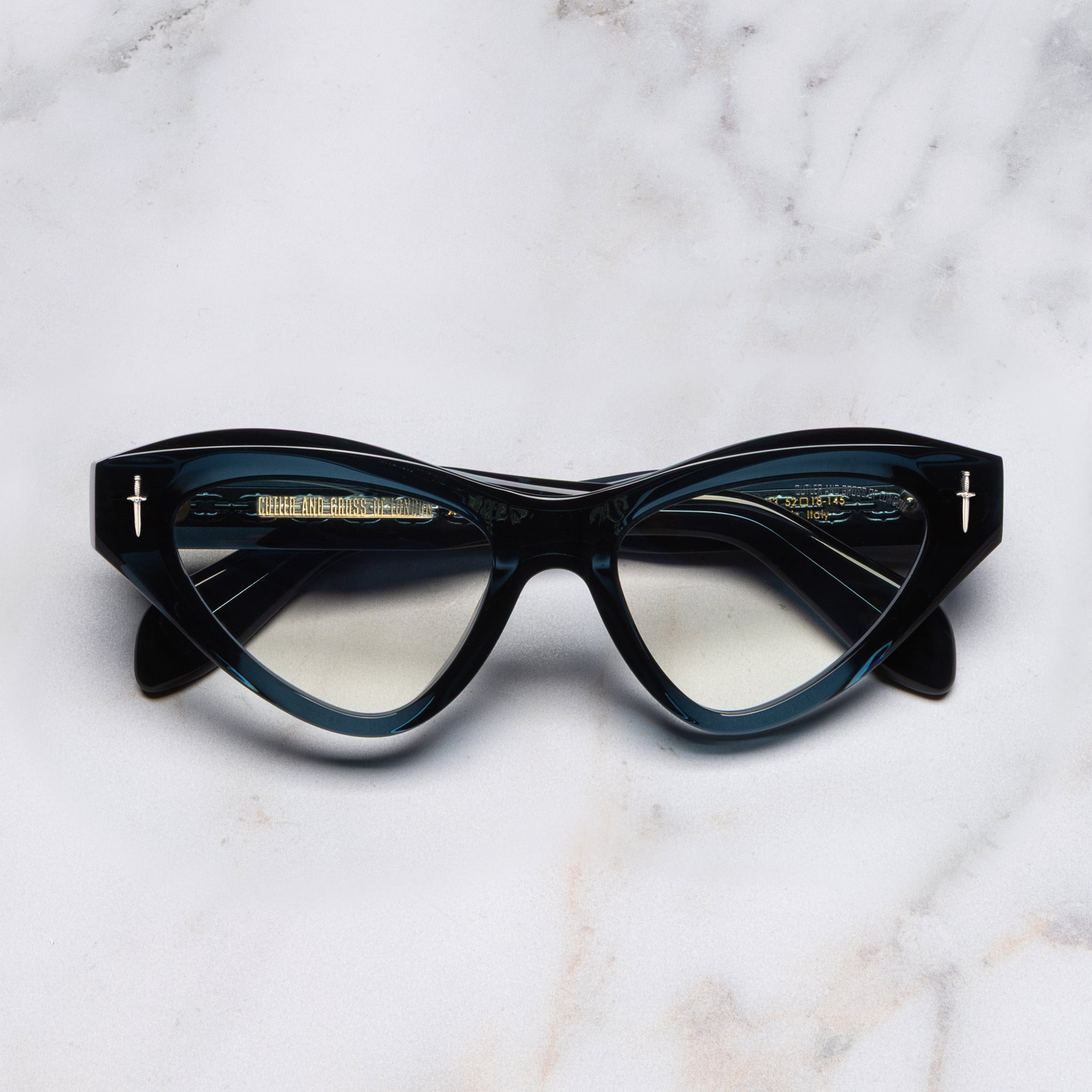 The Cutler and Gross X The Great Frog collaboration combines over 100 years of heritage craftsmanship, and this optical is a case in point. It's sculpted by hand to an eccentric cat-eye silhouette with Dagger frontal pins cast from Sterling Silver. Lock Down chain core wire structures the 50s-inspired shape, pinned by Big Eye rivets. Details - Handcrafted in Italy by expert craftspeople, read more about our craftsmanship story - The Great Frog Collection - Hand cast Sterling Silver Dagger frontal pins - 5-barrel hinges - Big Eye rivets - Custom Lock Down chain core wire - Gold-foil logo inside temple - Plectrum temple tips - Need help? Read our full Glossary of Terms Size & Fit SKU: GFOP-009-52-03 Frame shape: Cat-Eye Lens width (mm): 52 Temple length (mm): 145 Bridge width (mm): 18