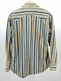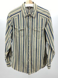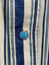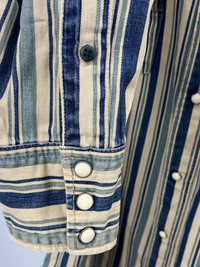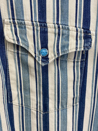 Old school 45rpm goodness! The classic Eastern Pearl snap shirt that gets a run out every season in various forms. From the rby45rpm line around 2001-2004 Indigo dyed All kinds of cool details including the turquoise button on the front being and the neckline being stitched in specially via red thread The ever present stitched "R" makes an appearance Made in Japan "Used" but this has tons of life left, vintage in every sense of the word Shoulder to shoulder: 19in Pit to pit: 21.5in Sleeve length: 24.5in Total length: 31.5in