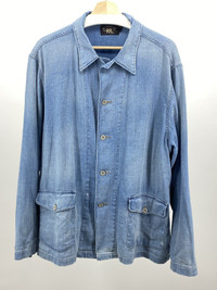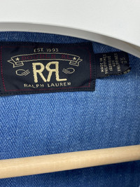 RRL Denim Chambray Chore Coat size XL Beautiful piece, all the trappings you would expect from RRL The fabric is really special - an ultra soft denim chambray with natural imperfections throughout that just add to the character Metal buttons including extras Please note the composition tag is missing Shoulder to shoulder: 21in Pit to pit: 25in Sleeve length: 25in Total length: 30.5in