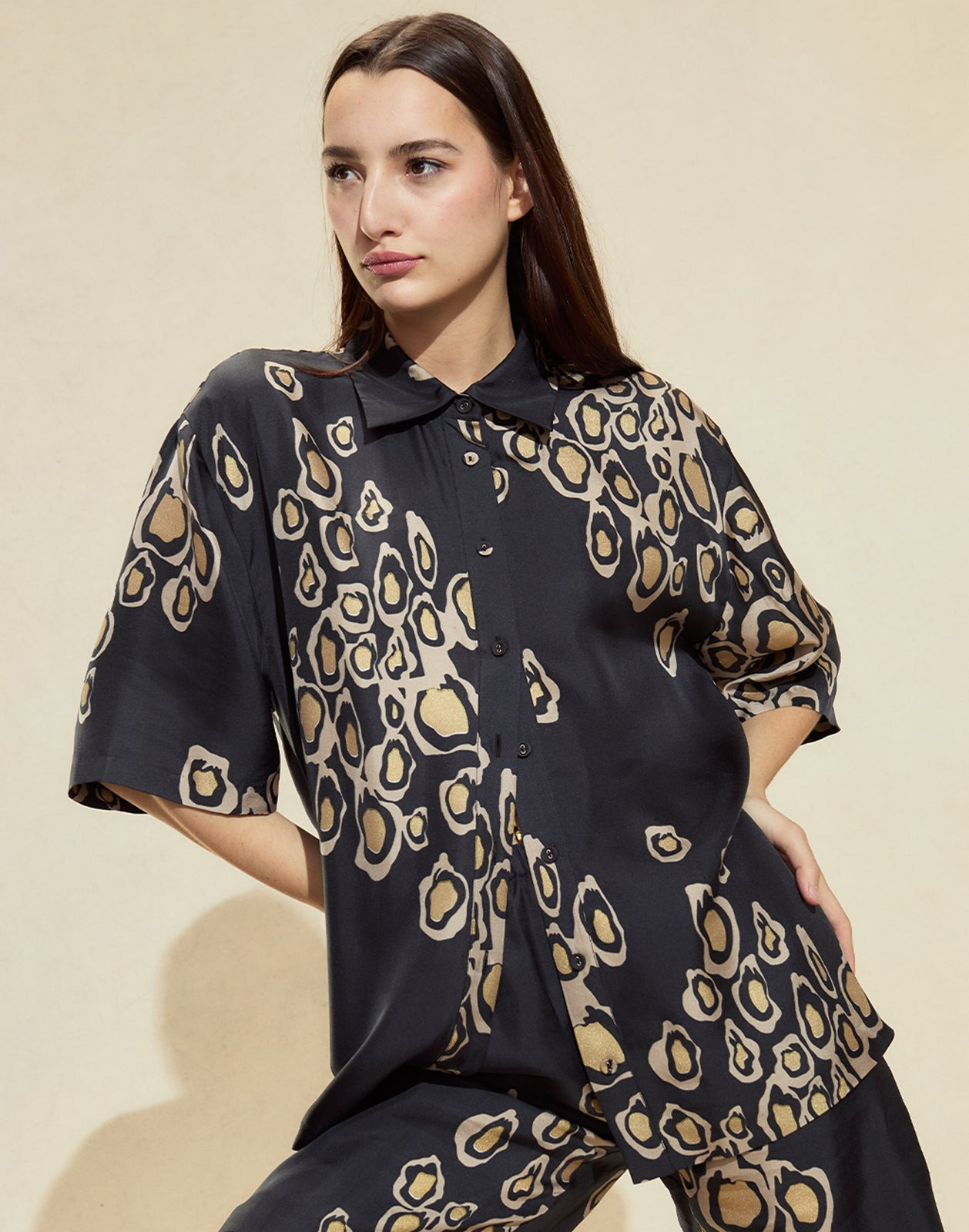Perfect for walking through cobblestone streets or on grotto getaways. Subtle metallic gold foil printed on a lightweight silk fabric. Throw over your bikini for the beach and style into the night with your favorite sequin skirt. - Spring/Summer 25’ - Composition: 100% Silk - Relaxed fit - Dry clean recommended - Fit: model is 5'9" and wears a size S. - Size S measurements: - Length from shoulder: 27"