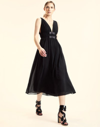The black dress to carry you through your busiest social season. Lightweight silk with embellished embroidered bows. - Fall '25 - Composition: 100% Silk - Fully lined - Dry clean only - Elastic waistband - V-neckline - A-line - Stretch - Fit: model is 5'9" and wearing size 2 - Size 2 measurements: - Length: 46" - Elastic waistband (unstretched): 12" - Elastic waistband (stretched): 20"