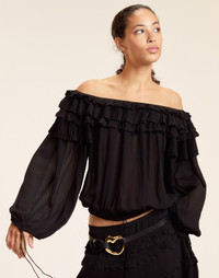 Your next date night look. Light, romantic, and effortless — pair it with the matching skirt or your favorite denim. - Composition: 100% Polyester - Unlined - Pull-on-style - Off-the-shoulder neckline - Relaxed, loose fit - Adjustable elastic drawstring at bottom hem and cuffs - Stretch - Dry clean only - Fit: model is 5'9" and wears a size S. - Size S measurements: - Length: 17" - Sleeve length from shoulder: 22.5" - Chest: 60" - Neck Elastic (Relaxed): 33"