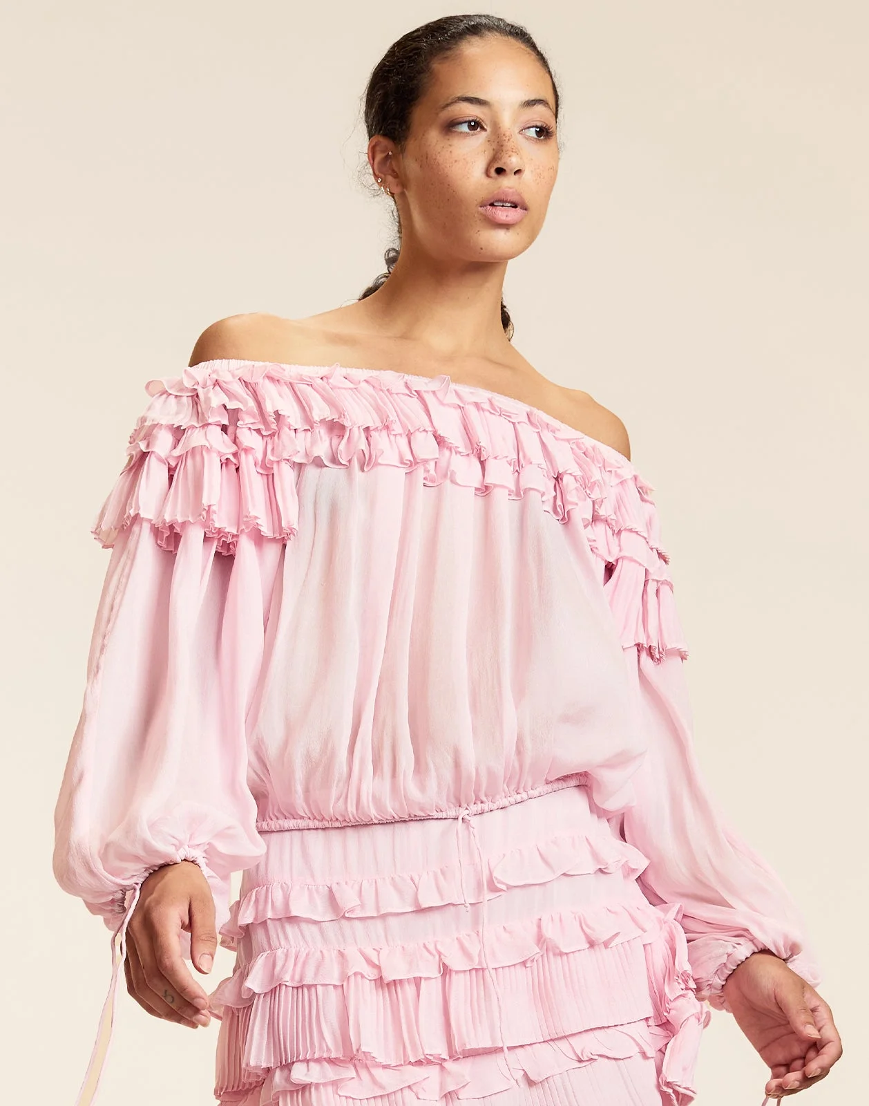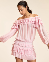 Your next date night look. Light, romantic, and effortless — pair it with the matching skirt or your favorite denim. - Composition: 100% Polyester - Unlined - Pull-on-style - Off-the-shoulder neckline - Relaxed, loose fit - Adjustable elastic drawstring at bottom hem and cuffs - Stretch - Dry clean only - Fit: model is 5'9" and wears a size S. - Size S measurements: - Length: 17" - Sleeve length from shoulder: 22.5" - Chest: 60" - Neck Elastic (Relaxed): 33"