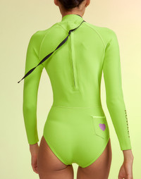 PLEASE NOTE! Wetsuits are EXCHANGE ONLY. .5 MM Fiber-Lite Neoprene. - Lime green - Covered back zip with nylon pull and secure velcro closure - Coin pocket on lower back with pink heart detail - Cynthia Rowley logo on sleeve - High cut hips - SPF 50+ - Fabric content: 80% neoprene, 20% nylon - Care instructions: hand wash, hang to dry Fit: model is 5'11" and wears a size S. Our wetsuits and neoprene swim styles are made using green technology, contributing to a gentler environmental impact. By using earth mined limestone in place of petrochemicals, and recycled materials such as tires and plastic bottles, water resources are conserved and carbon footprint is significantly reduced. We are proud to create eco-friendly products that can be enjoyed across oceans world-wide. Our wetsuits are produced in limited-edition runs, when they sell out they are gone forever.