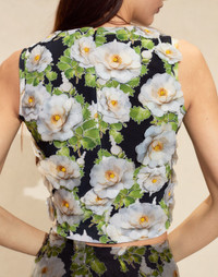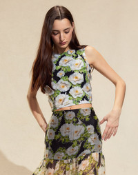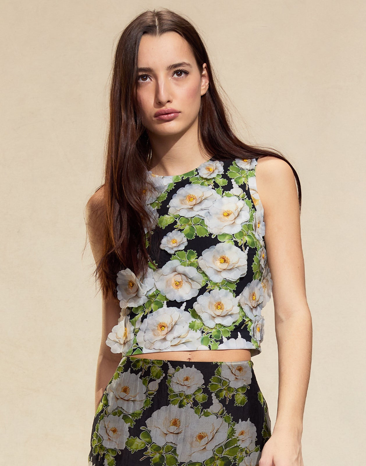 Pretty flowers bloom on this sporty silhouette. Stretched tulle with silk organza 3D floral appliques. Dress it up with your favorite black blazer for a night out. - Spring/Summer 25' - Composition: 100% Silk - Fully lined - Special dry clean recommended, store in garment bag - Fit: model is 5'9" and wearing size S. - Size S measurements: - Length: 17”