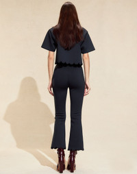 Everybody's favorite buttery soft bonded material reinvented with laser cut scallop edge detailing. Fitted throughout the leg with slight flare and cropped fit. - Spring/Summer 25’ - Composition: 100% Polyester - Concealed back center zipper - Machine wash cold, hang dry, but dry clean recommended. - Fit: model is 5'9" and wears a size 2. - Size 2 measurements: - Full length: 37.75" - Inseam: 27.5" - Waist: 13.25''