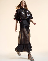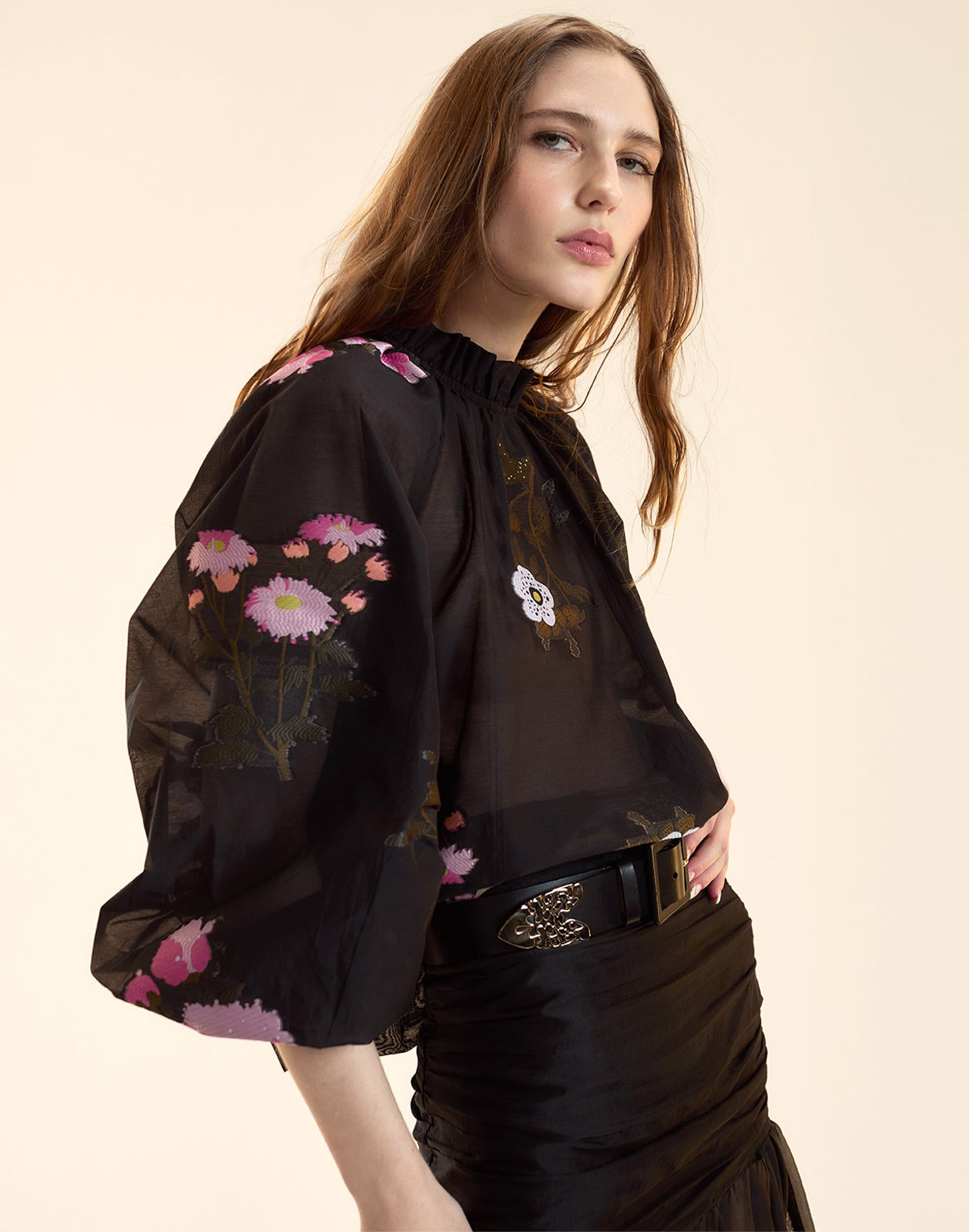 Our classic best selling silhouette in a custom fil coupe fabric. This unique yarn mimics the look of embroidery, yet is seamlessly woven into the lightweight jacquard. - Fall 25' - Composition: 74% polyester, 18% cotton, 8% polymide - Slightly sheer fabric - Hand wash cold, dry clean recommended - Fit: model is 5'9" and wears a size S - Size S measurements: - Front length: 22.75" - Sleeve length from neckline: 26.5"
