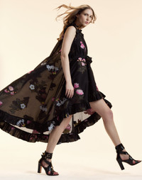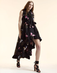 A lightweight high low dress dress, synching in the front and bringing drama to the back. This unique yarn mimics the look of embroidery, yet is seamlessly woven into the lightweight jacquard. - Fall 25' - Composition: 74% polyester, 18% cotton, 8% polymide - Slightly sheer fabric - Hand wash cold, dry clean recommended - Fit: model is 5'9" and wears a size S - Size S measurements: - Front Length: 30" - Back Length: 50"