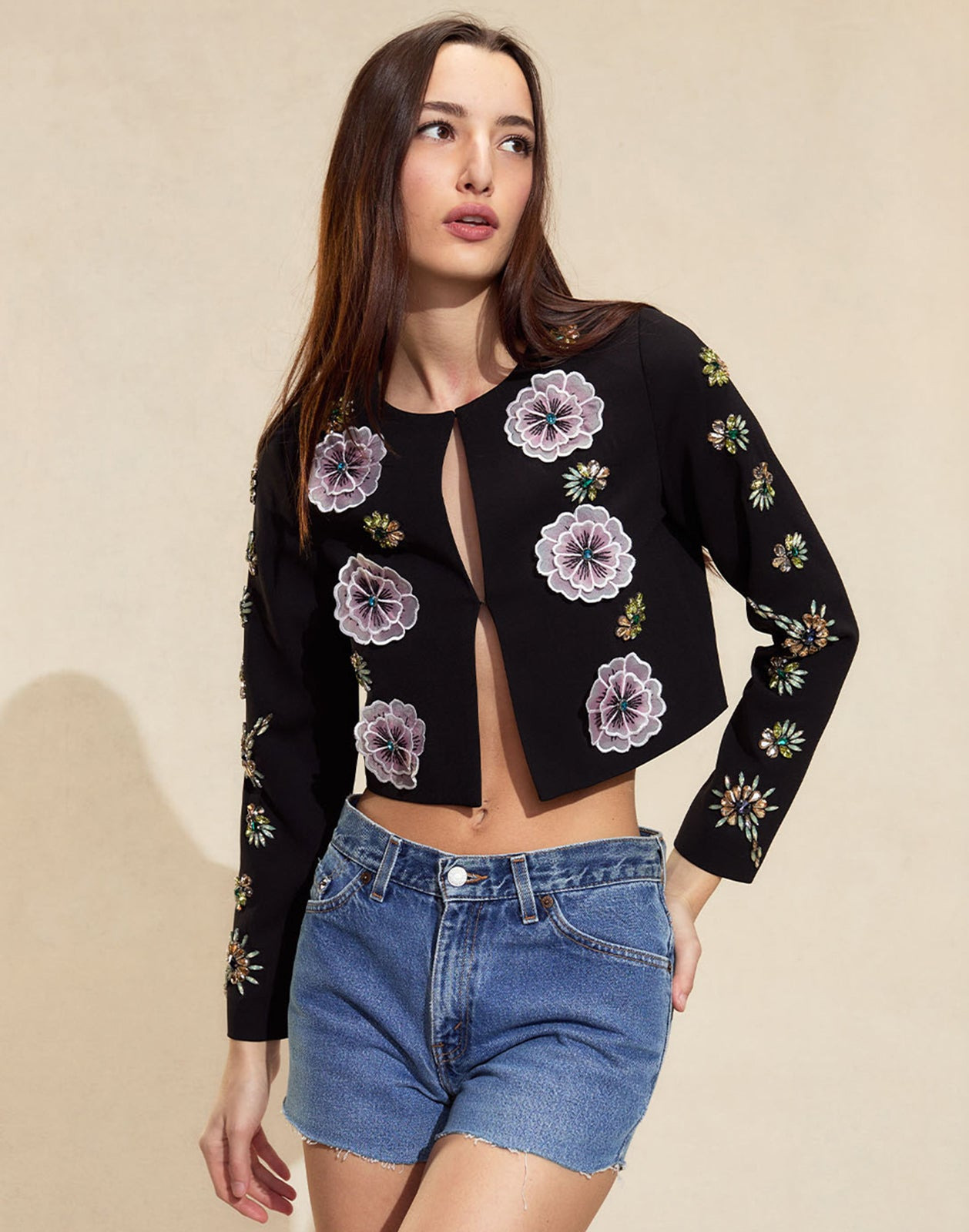Floral embellished cropped jacket FINAL SALE - Non-returnable - Hand-applied floral appliques with sequin embellishments - Cropped fit - Hook closure - Fully embellished sleeves with coordinated floral motifs - Round collarless neckline - Fully lined - Fabric content: 65% polyester, 35% wool - Care instructions: dry clean only Fit: model is 5'9" and wears a size 2. Size 2 measurements: Length: 16" Complete the look: - Florencia Embellished Skirt - Date Night Heels
