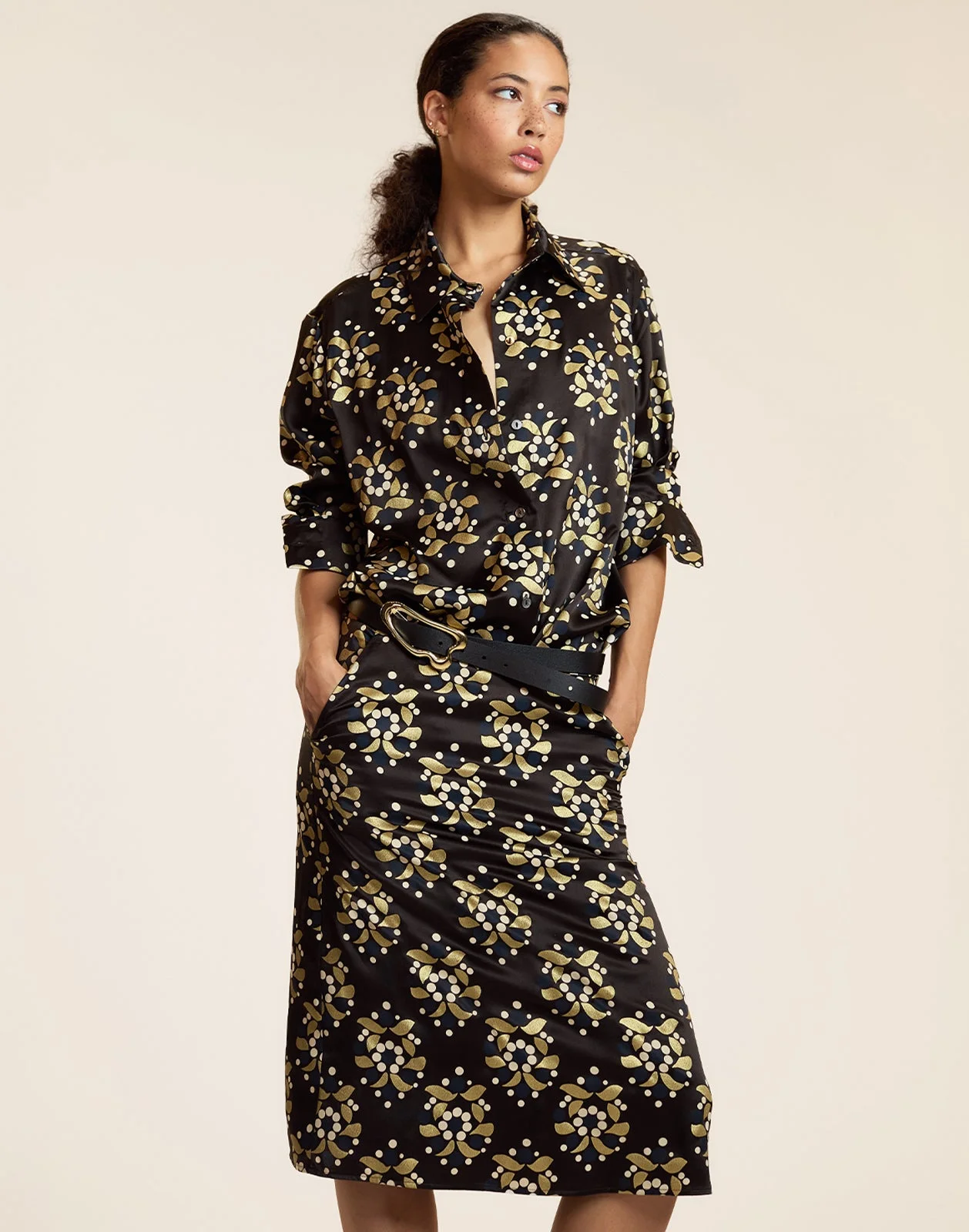 A sleek, modern midi skirt featuring a unique geometric pattern. Wear it with the matching top for a statement or style it with your favorite basic for an effortless look. - Composition: 55% Wool, 45% Silk - Fully lined - Concealed side zipper - No stretch - Side pockets and back patched pockets - Dry clean recommended - Fit: Model is 5'9" and wears a size 2 - Size 2 measurements: - Skirt Length: 27"