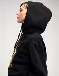 Oversized cozy hoodie with abstract gold foil heart - Spacious hood, adjustable drawstrings, and ribbed cuffs and hem - Gold leaf heart - Front pocket - Relaxed fit - Fabric content: 60% cotton, 40% Polyester - Care: machine wash cold, tumble dry low Fit: model is 5'8" and wears a size S Complete the look: - Wellesley Flannel Suiting Shorts - The Everyday Jean