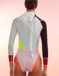 .5MM Fiber-Lite colorblock Neoprene wetsuit. - Asymmetrical colorblock design - Back zip closure with nylon pull - Zip coin pocket on lower back - SPF 50+ - Fabric content: 80% neoprene, 20% nylon - Care instructions: hand wash, hang to dry Fit: model is 5'10" and wears a size S. Our wetsuits and neoprene swim styles are made using green technology, contributing to a gentler environmental impact. By using earth mined limestone in place of petrochemicals, and recycled materials such as tires and plastic bottles, water resources are conserved and carbon footprint is significantly reduced. We are proud to create eco-friendly products that can be enjoyed across oceans world-wide. Our wetsuits are produced in limited-edition runs, when they sell out they are gone forever.