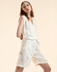 Printed metallic gold foil on a lightweight fabrication. Wear as a set or throw on with anything in your closet. - Spring/Summer 25’ - Composition: 55% Rayon, 45% Viscose - Machine wash cold, dry flat, but dry clean recommended - Fit: model is 5'9" and wears a size S. - Size S measurements: - Length: 26”