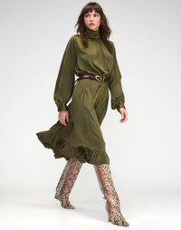 High-neck silk charmeuse dress - A-line silhouette - Gathered high neckline - Balloon sleeves with buttoned cuffs - Tiered hemline with ruffle trim - Back yoke pleats - Side-seam pockets - Fabric content: 100% silk charmeuse - Care instructions: Dry clean only Fit: Model is 5'8" and wears a size S. Size S measurements: - Length: 48" Complete the look: - Embossed Leather Wedge Boot - Signature Thin Buckle Belt - New Heels Coming Soon!