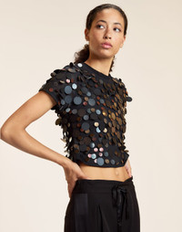 Delicate paillettes on a flattering tee, perfect for a night out or cocktails on the town. Pair with your favorite denim or mini skirt. - Composition: 100% Polyester - Double layered mesh - Pull-on-style - Fitted - Stretch - Fit: model is 5'9" and wears a size S. - Size S measurements: - Body length: 16.5” - Bust: 15" - Sleeve length: 6.5"