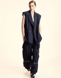 A new silhouette, perfect for layering. An instant classic in a navy and ivory pinstripe. - Fall '25 - Composition: 100% Polyester - Oversized fit, double breasted - Hand wash cold, dry clean recommended - Fit: model is 5'9" and wears a size S - Size S measurements: - Front Length: 29"