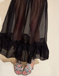 Silk organza for all summer long. The fitted waist and tiered bottom ruffle brings movement with every step. Pair it with the Metallic Bow Tee and the Cece Wrap Heel for a mix of comfort and style. - Spring/Summer ‘25 - Composition: 100% Silk - Fitted top, billowy through hem - Half lined - Detachable slip, can be worn with or without - Dry clean only - No stretch - Fit: Model is 5’9 and wears a size 4 - Size 4 Measurements: - Waist: 27" - Hip: 37" - Length: 40”