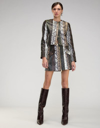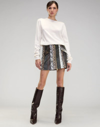 It’s the year of the snake! Made from luxe-snake embossed vegan leather in a dynamic, multi-tone patchwork, this mini skirt is bound to stand out in your closet. A sleek front zipper with gold hardware and coordinating snap buttons add a luxe touch, while two structured flap pockets bring both style and functionality. Pair this skirt with the Snake-Embossed Vegan Leather Cropped Jacket or the Snake Embossed Vegan Leather Bomber Jacket for a coordinated head-to-toe look. Ring in the warm weather and wear with the Nailed It Classic Loafer or with Embossed Leather Wedge Boot in the cooler months. - Spring/Summer 25' - Composition: 100% polyester - Hand wash recommended - Fit: Model is 5’8’ and wears a size 2 - Size 2 Measurements: - Length: 16.5”