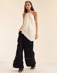 Black or white silk twill halter attached to a gold tone choker. Super chic and modern, the perfect summer getaway top. - Spring/Summer '25 - Composition: 100% Silk - Gold-tone neck ring - Dry clean only - Fit: model is 5'9" and wears a size S. - Size S measurements: - Center front length: 21.5” - Bust width: 14”