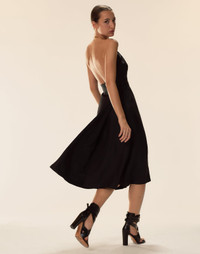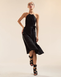 Black or white silk twill halter attached to a gold tone choker, super chic and modern. - Spring/Summer '25 - Composition: 100% Silk - Wrap dress style with waist tie - Gold-tone neck ring - Dry clean only - Fit: model is 5'9" and wears a size S. - Size S measurements: - Length: 42.5” - Bust width: 15”