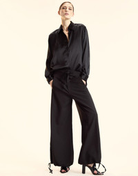 Your new favorite pant, with endless ways to style them. Easy to throw on as a set or with your go to tee. - Fall 25' - Composition: 90% Polyester, 10% Silk - Unlined - Dry clean only - Concealed zip fly and hook-and-bar closure - Relaxed fit - Drawstring waistband and elastic drawstring hem - Standard 4 pocket style (front & back) - Style runs slightly large, recommended to size down - Fit: model is 5'9" and wears a size S. - Size S measurements: - Inseam: 28.75" - Outseam: 41.5"