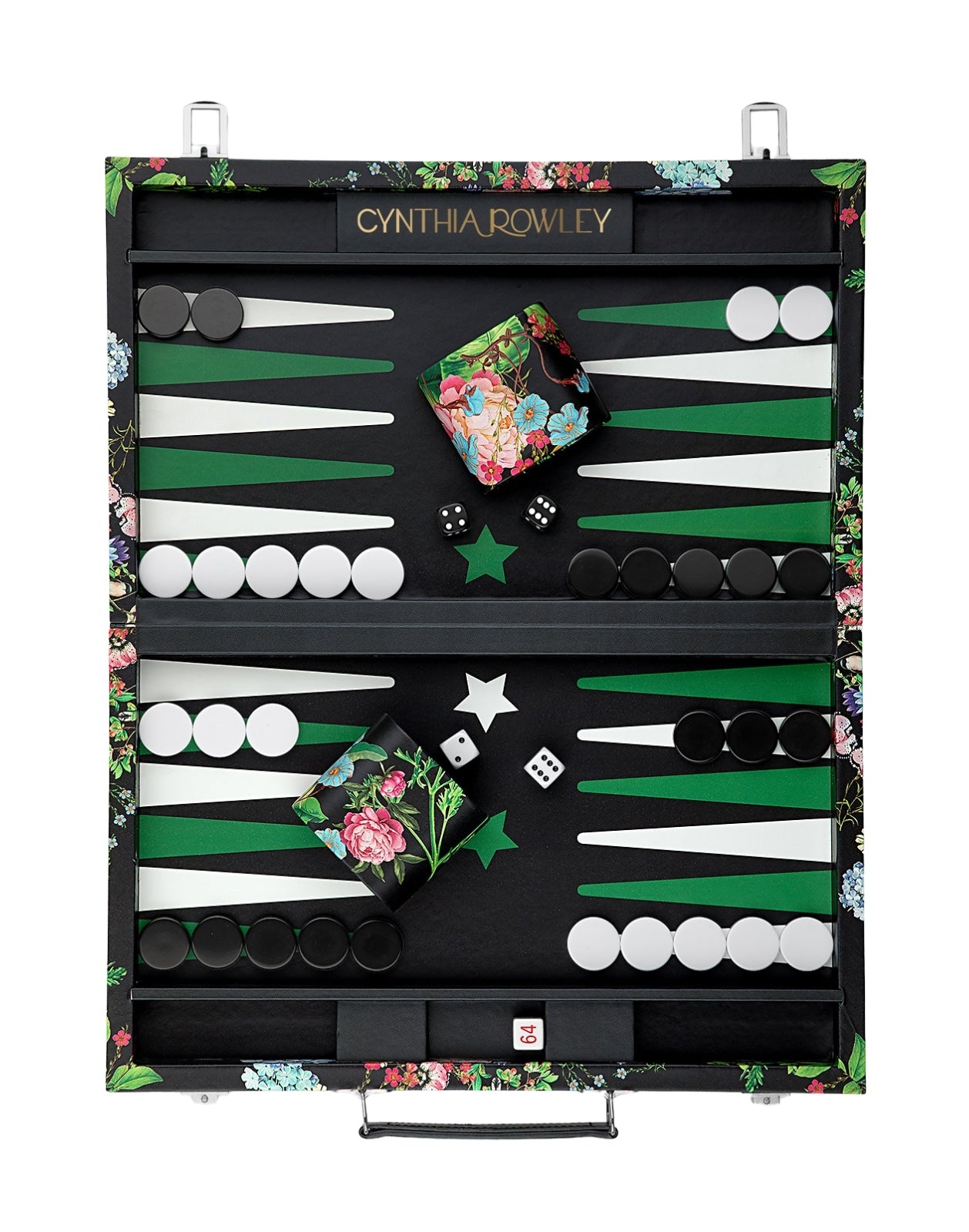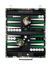 Black floral printed Vegan Leather Backgammon Set - Vegan leather set game case with 30 checkers, four dices, one doubling cube and 2 dice cups - 15”L x 2”H x 9 1/4"W (closed), 18 1/2”W (open) - Printed vegan leather in original Cynthia Rowley artwork. - Wipe clean with a soft, dry cloth. Store in a dry place. Final Sale