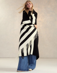 Wool Cashmere Blanket Wrap FINAL SALE - Non-returnable - Premium soft wool and cashmere blend - Bold black and white striped pattern - Oversized design for versatile wear: drape as a wrap, scarf, or blanket - Soft fringe detailing - Fabric content: 70% wool, 30% cashmere - Care instructions: Dry clean only Fit: One size fits all Dimensions: 50" x 72"