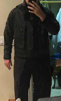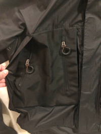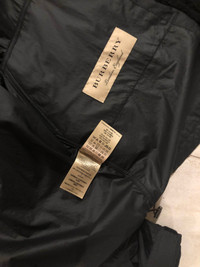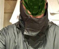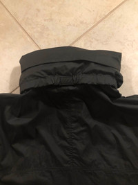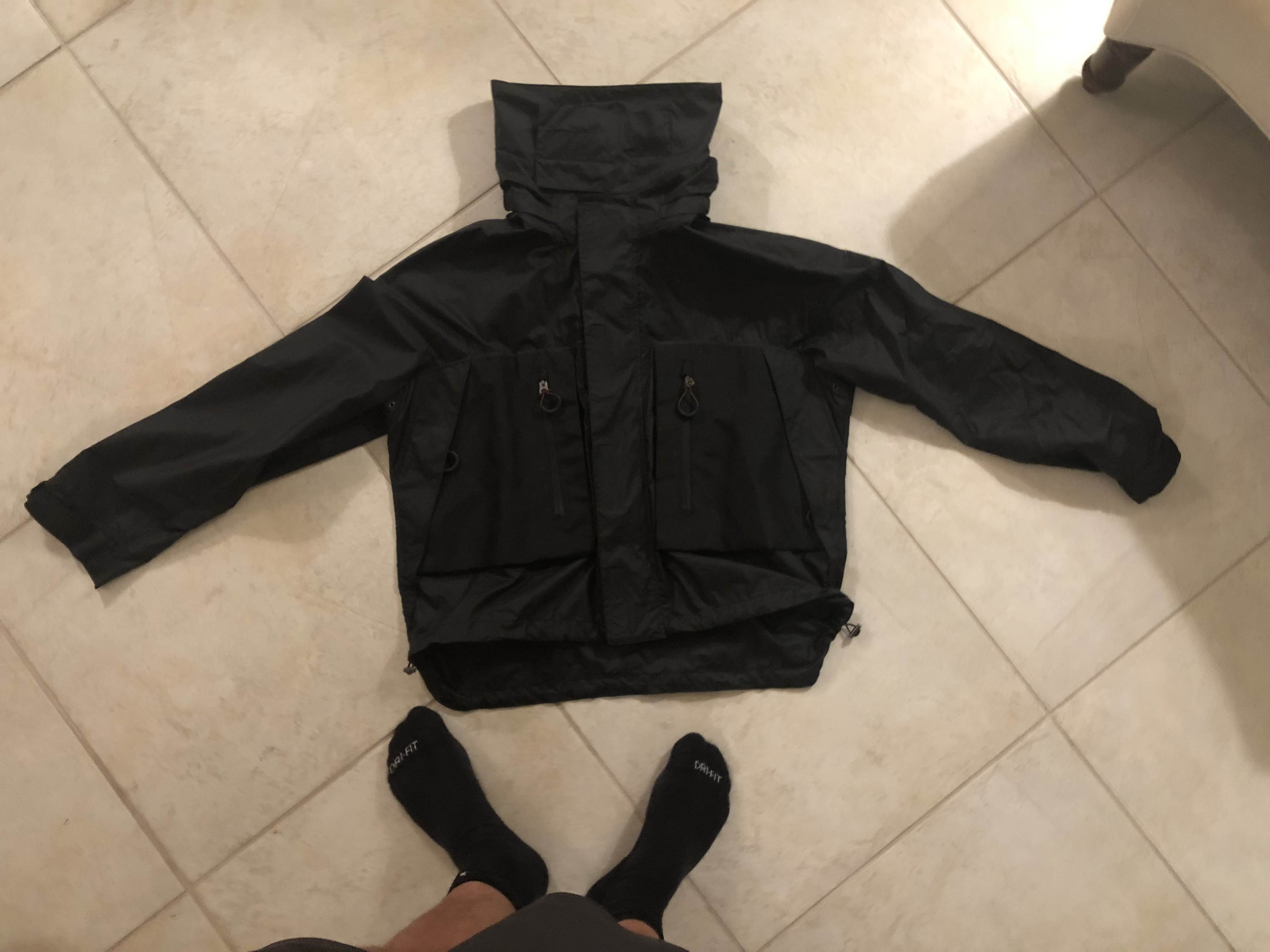 Back windbreaker, I don’t know the model. The collar is very cool and can be displayed multiple ways. Two large front pockets, storable hood, Velcro cuffs, it is a cropped fit. Jacket is size 52 IT. In the last two photos I’m showing that the different ways to wear the collar. It can be turned down like a shawl collar or worn up and it actually is so high it protects your ears from the wind.