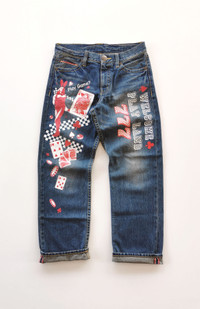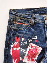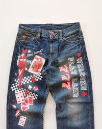 CoAndLu Casino Printed Selvedge Denim Jeans. Size 30. Redline selvedge. Seeing selvedge coin pocket. Used item in good condition. A little bit yellowish at back pocket. Actual Manual Measurement In Inch While Jeans Are Lay Flat. Waist : 15' Front Rise : 10.5' Thigh : 12' Knee : 9' Leg Opening : 8' Inseam : 29' Outseam : 39' 🗳️ Shipping W.Wide With : DHL EXPRESS. 🧾 Payment Methods : PAYPAL ONLY. 🫔 Message for any question. No refund, Return, Trade or Exchange. All Sale Are Final. 📝 Note : Dont worry about Tax. All parcels marked like gift with $25-$30 Value. (CODE A305)