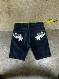Dark denim sta frie logo in the back Made in Japan Bape Denim shorts Measurements are included in the pictures DM any questions Fits 34W
