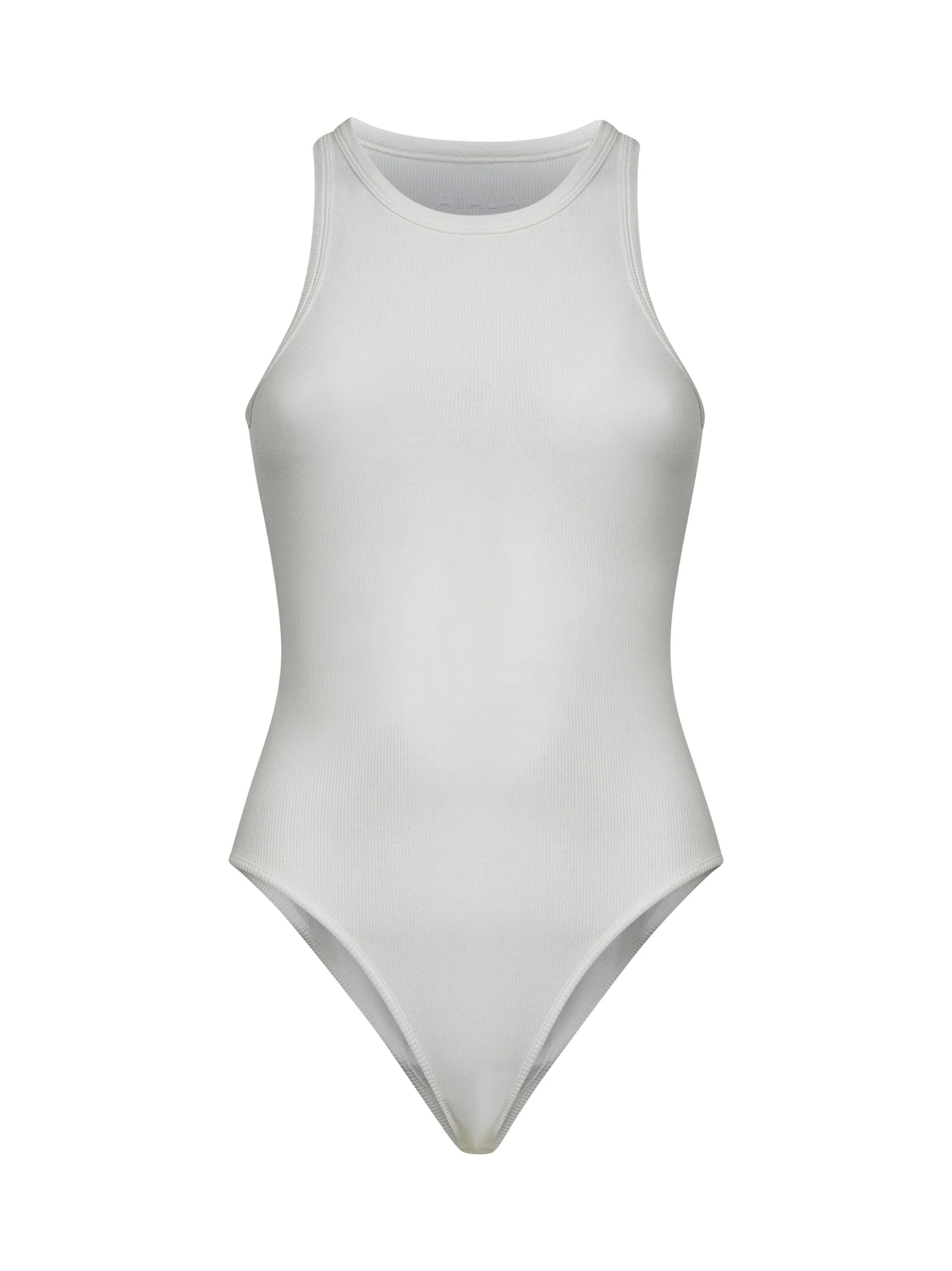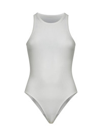 - Snap button closure at crotch - Crewneck; sleeveless, halter armholes - Tone-on-tone alaia logo embroidery at nape - Sculpting-rib stretch viscose and cotton jersey design - Bodycon fit - White color - 48% viscose, 47% cotton, 5% elastane - Made in italy Natural (Veg): Cotton47 % Synthetic: viscose48 % Synthetic: Elastane5 % Made in: ITALIA Season: A25 AA9B0382J085B-020